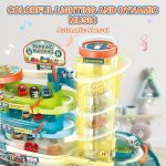 - Interactive Sound Effects: This toy car track playset features engaging sound effects that require three AA batteries (NOT included). The steering wheel buttons produce realistic car sounds or delightful music. adding excitement to your child’s driving play. The parking garage elevator. with its colorful lights and cheerful music. spirals cars to the top floor. bringing even more surprises.