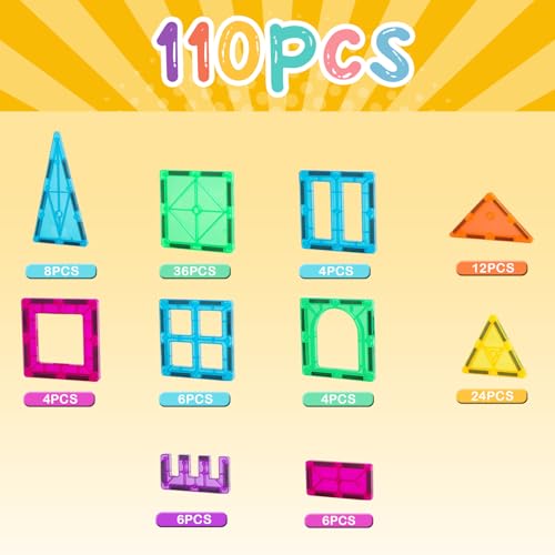 FNJO Magnetic Tiles. 110PCS Magnet Building Set. Magnetic Building Blocks.Construction STEM Learning and Playing Toys for Kids. Montessori Toy for Preschool Boys Girls Toddlers Classroom Must-Haves