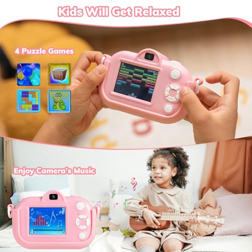 - Built-in Puzzle Games and Music. Kids Will Get Relaxed: Specially designed with Puzzle Games and Music Player functions. your child will have more fun with the kids camera. The built-in 4 puzzle games could help to enhance kids’ thinking ability and intelligence development when they are tired of taking photos. Moreover. you could download music or story from your computer to the kid camera via Micro-USB cable included. your kids will enjoy the music or story when they are sleeping