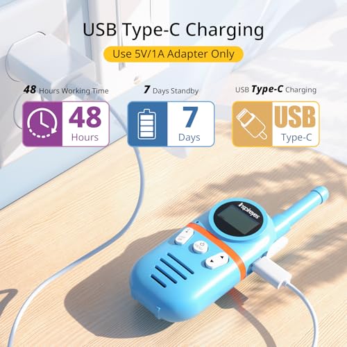 - Inspireyes rechargeable kids walkie talkies are rechargeable and long lasting. featuring an upgraded built-in lithium polymer battery. There is no need to buy extra AAA batteries. Kids can enjoy up to 48 hours of playtime and 7 days of standby on a single charge.